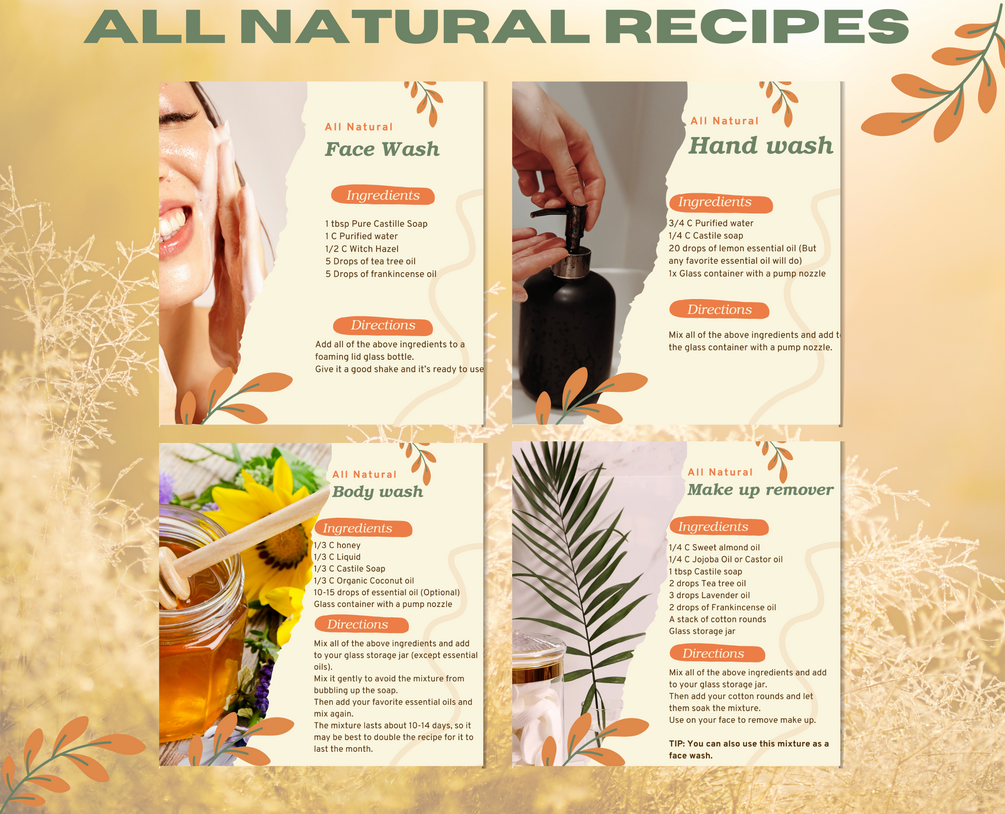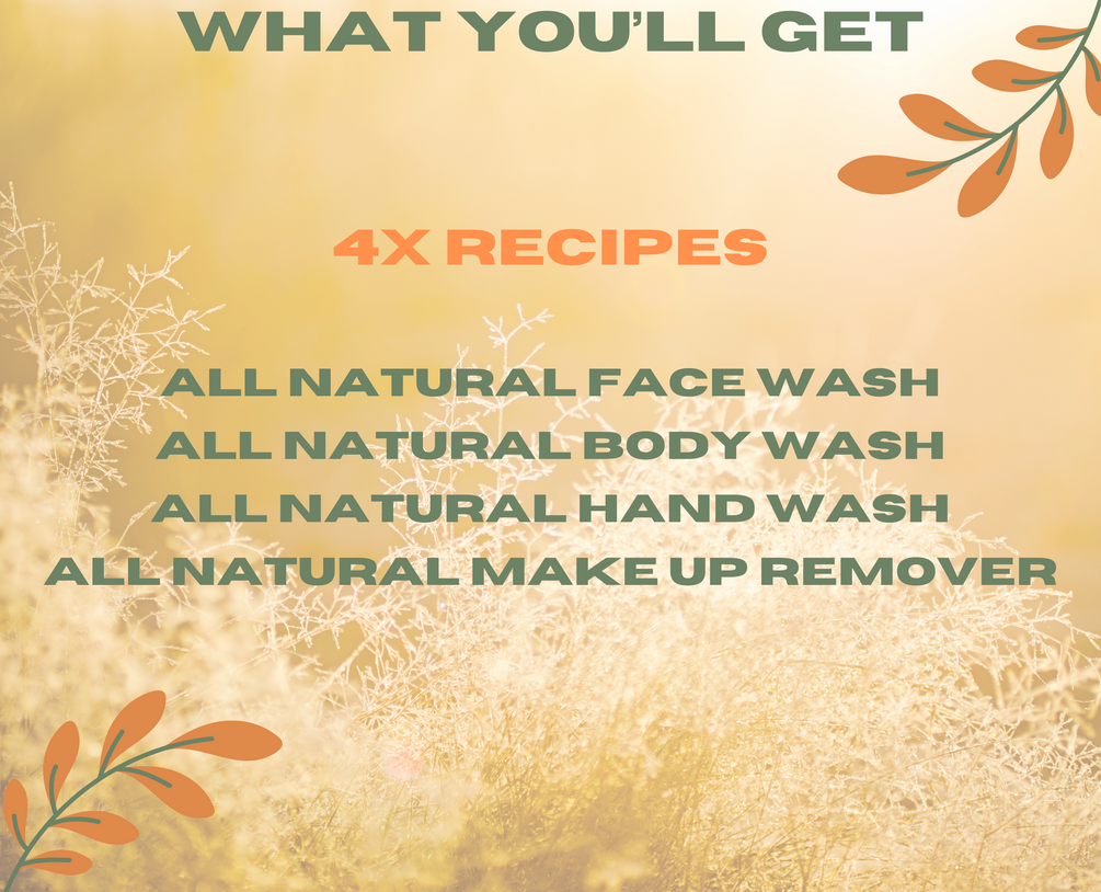 1x Natural face wash recipe, 1x Natural make up remover recipe, 1x Natural body wash and 1x Natural hand wash
